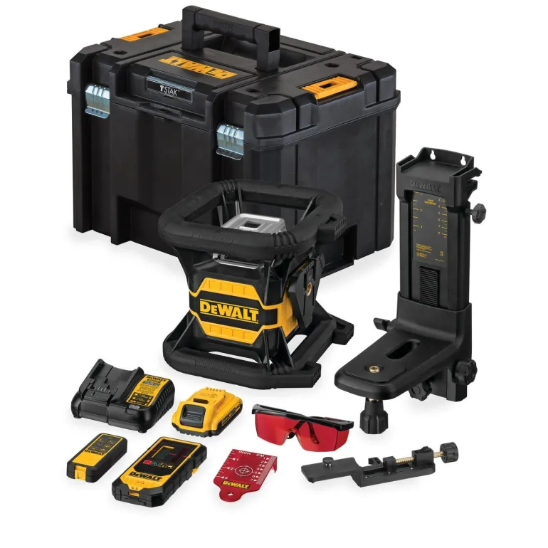Dewalt DCE080D1RS-QW on punainen pyörivä laser, joka toimitetaan TSTAK-säilytyslaukussa. Laturi, akku, tähyslevy, lasit, seinäkiinnike ja ilmaisin sisältyvät toimitukseen.