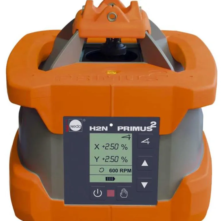 Nedo Primus2 H2N:n työalue on yli 700 metriä tarkkuuden ollessa 1,5 mm/30 m. Voit asettaa halutun kaadon/kallistuksen sekä x- että y-akselille numeroin. Laservastaanottimessa Nedo H2N Commander2 on iso sja selkeä näyttö, joka näyttää kallistuksen, kierrosluvun, laserin akun latauksen yms. Vastaanotin toimii myös toimii kaukosäätimenä laserin kaikille toiminnoille. Laservastaanotin toimii kolmella alkali- tai ladattavalla AA-paristolla.