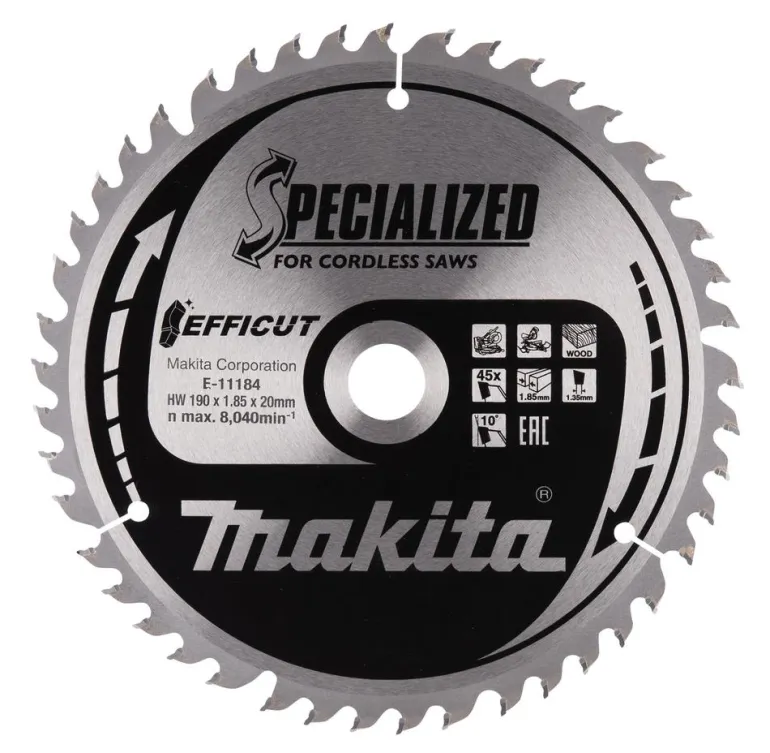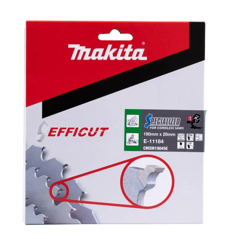 Makita EFFICUT -pyörösahanterä on erityisesti akkukäyttöisille katkaisu- ja jiirisahoille suunniteltu 190 mm ja 45-hampainen terä, joka soveltuu puulle.