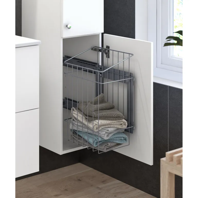 Pyykkikorin sisäosa, joka sopii asennettavaksi Graphic Base korkeisiin kaappeihin. Pyykkikori on laajennettavissa ja irrotettavissa, jotta se voidaan kuljettaa helposti pesutilaan. Soveltuu vasemmalle tai oikealle.