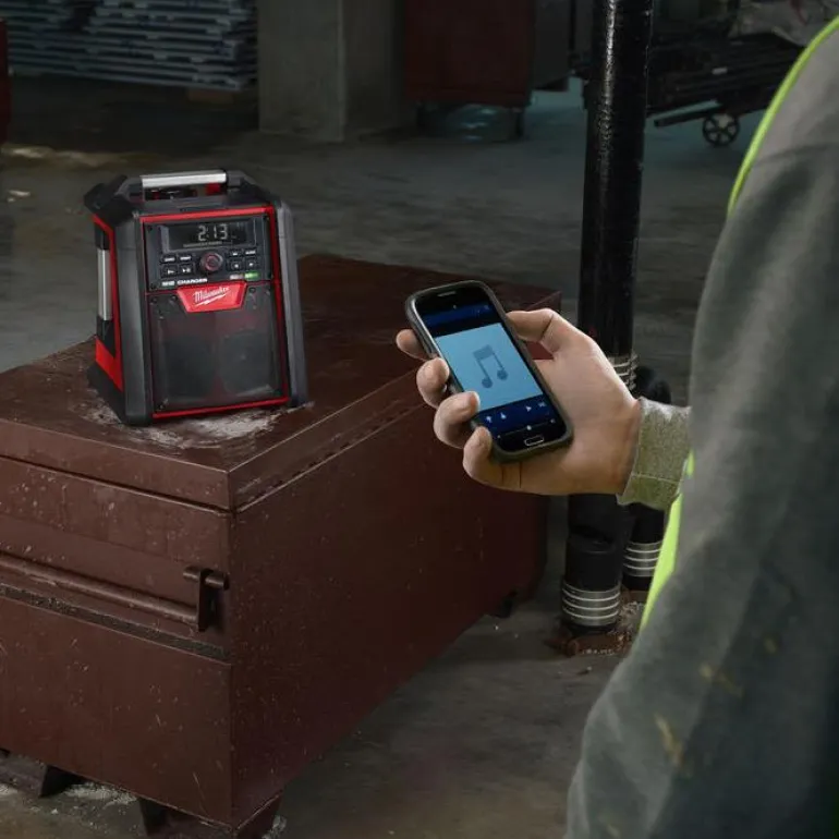 Milwaukee M18 RC-0 on bluetooth-yhteydellä varustettu radio, jolla voit kuunnella musiikkia langattomasti älypuhelimesta tai tabletista. Sisäänrakennettu laturi ja 40 W:n vahvistin, joka tuottaa täyteläistä ja kirkasta ääntä.