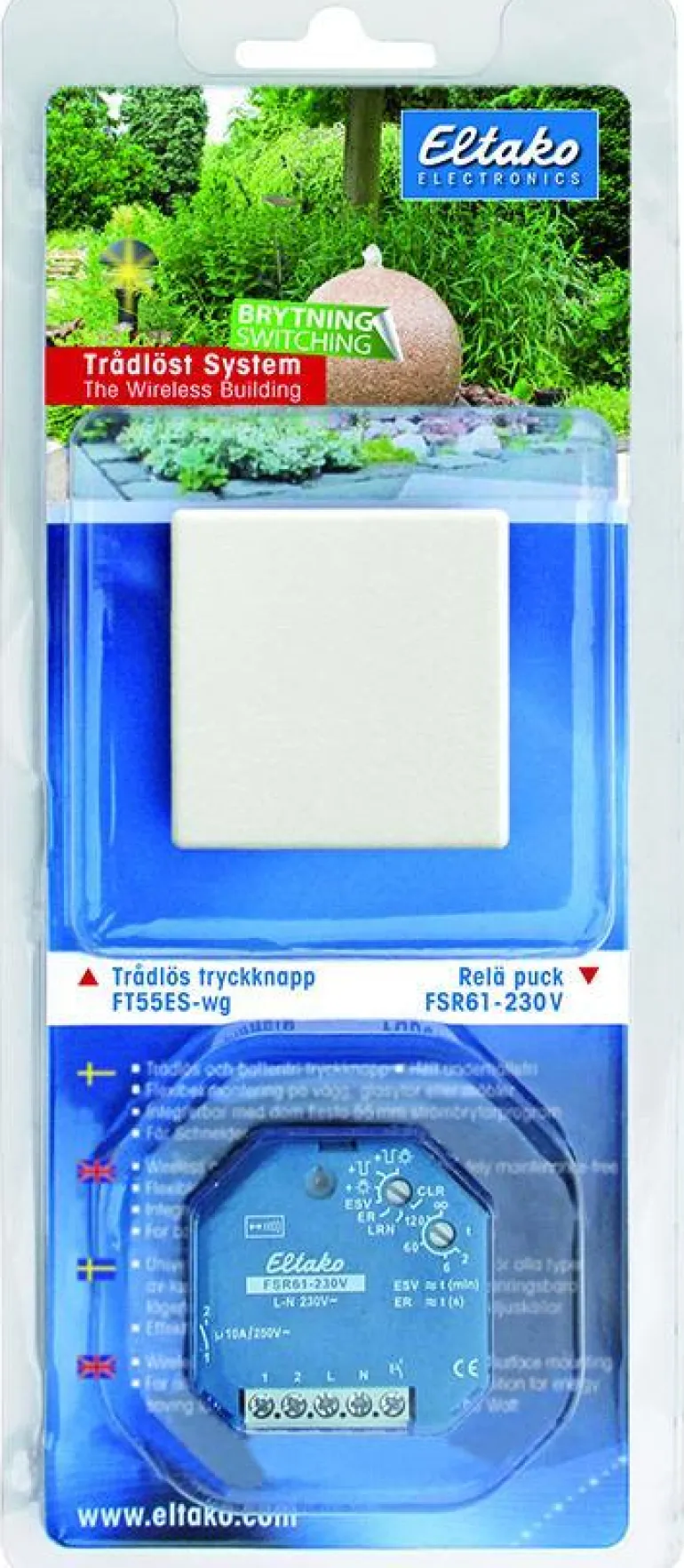 Läpipainopakkaus ”katko” koostuu paristottomasta, langattomasta painonapista, valkoinen FT55ES-wg (toimitetaan ilman ulkokehystä), joka täydennetään Schneider-kehyksellä. Mukana kytkinkiekko FSR61-230V, jossa impulssi/työvirran reletoiminto.