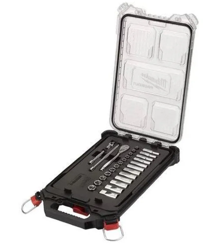 Metrinen 1/4″räikkäkahva toimitetaan kompaktissa PACKOUT-valikoimassa, jossa on 28-osainen hylsysarja. Hylsysarja sisältää sekä vakiohylsyjä että pitkiä hylsyjä, koot 5–15 mm.