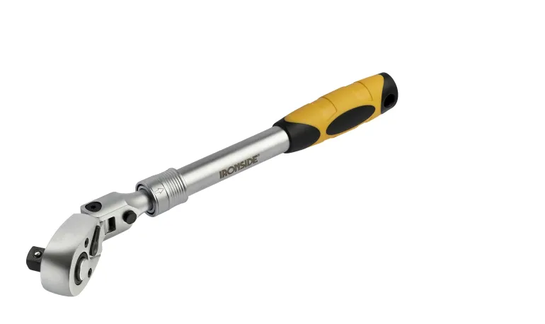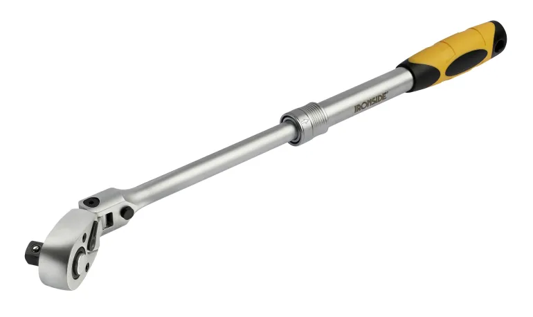 ½” nivelletyllä päällä. Mattakromattua kromivanadiiniterästä. Teleskooppikädensija, pituus 350–490 mm, ja kaksikomponenttikahva. Säädettävä, 72 hammasta. Pikavapautustoiminto.