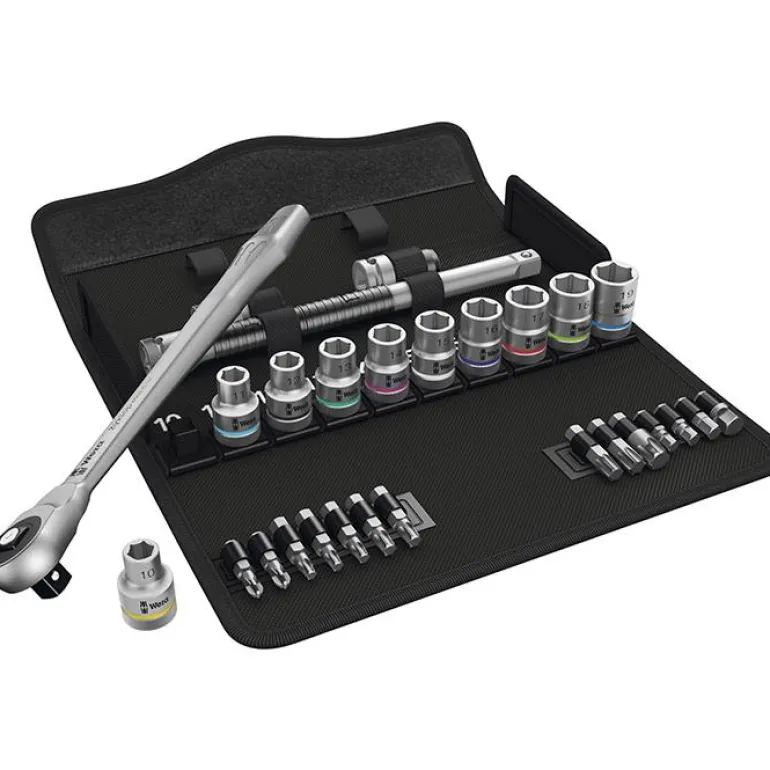 28-osainen räikkäavainsarja 1/2-tuumaisella vääntiöllä ja läpäisevällä neliöllä. Pakkauksessa on Zyklop Metal -räikkä, 10 Zyklop-hylsyä, yksi Zyklop-jatkovarsi, yksi Wobble-jatkovarsi, pikakiinnityksellä varustettu sovitin ja 14 erilaista kärkeä. Osat toimitetaan tukevassa, kompaktissa tekstiilikotelossa, joka voidaan sijoittaa pystyasentoon, joten työkalut ovat aina helposti saatavilla.