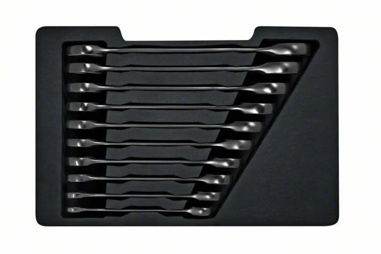 10-osainen sarja sisältää yleisimmin tarvittavat räikkäavainkoot: 8, 10, 12, 13, 14, 15, 16, 17, 18 ja 19 mm. Sarja toimitetaan kätevässä sisämuottipuoliskossa, joka on yhteensopiva Boschin L-BOXX Mobility System -järjestelmän kanssa.