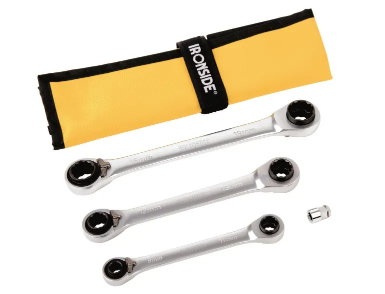 Kompakti sarja kromi-vanadiiniteräksisiä avaimia, 3+1 osaa ja 13 toimintoa. Nopea kiertosuunnan vaihto.