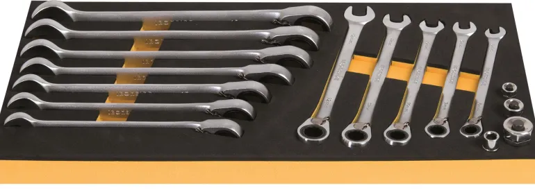 Sisältö:12 kpl Räikkälenkkiä taivutetulla lenkkipäällä; 8, 9, 10, 11, 12, 13, 14, 15, 16, 17, 18, 19 mm. 3 kpl Hylsyadapteria; 1/4″, 3/8″, 1/2″.