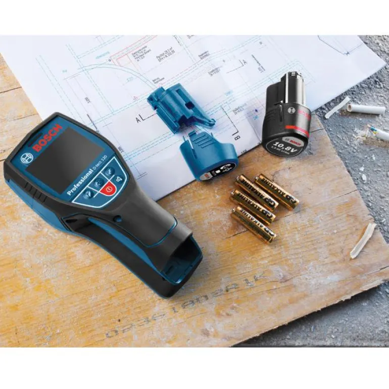 Bosch Wallscanner D-tect 120 Professional on akkukäyttöinen rakenneilmaisin 12V. Toimii 10,8 V:n akuilla ja tavallisilla AA-alkaliparistoilla.