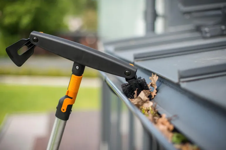 Räystäskourun puhdistaja, harjan ja raaputtimen yhdistelmä puhdistaa räystäskourut tehokkaasti.