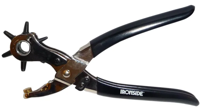 Pahville, nahalle jne. Puristettua teräslevyä, kuusi erikokoista lävistyspäätä. Niklattu. PVC-kädensija. Parhaaseen tulokseen päästään käyttämällä vastatyynyn päällä nahkapalaa. Reikäkoot 2, 2.5, 3, 3.5, 4, 5 mm.
