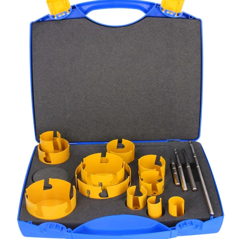 Reikäporasarja, joka sisältää reikäporanterät 32, 35, 44, 54, 60, 68, 73, 83, 105, 114 ja 133 mm. Reikäporat toimitetaan käytännöllisessä laukussa, joka sisältää myös HSS-poranterän, HSS-poranterän XL, Stubby-adapterin ja betoniporanterän.