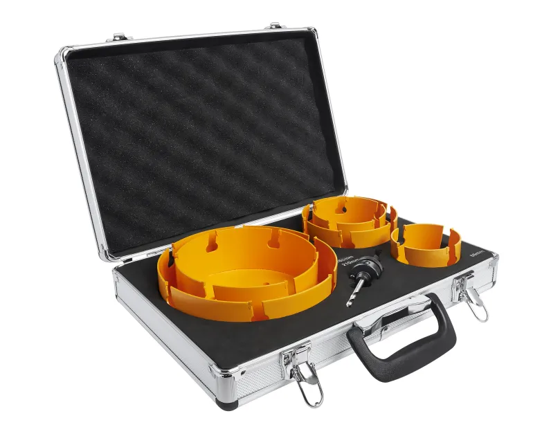 Syvä reikäsahamalli kovametallihampailla. Sarjat, jossa reikäsahat Ilmanvaihto HM. Eri asennuksiin ja työtehtäviin sovitetut kokoyhdistelmät. Toimitetaan käytännöllisessä alumiinilaukussa. Jopa 5 kertaa nopeampi kuin bimetallireikäsaha kaikissa ei-alumiini-, rauta- ja teräsmateriaaleissa. Voidaan käyttää kovametalliterällä varustetun keskiöporan kanssa myös kivi-/kalkkimateriaalille kovuuteen 6 asti. Reikäsahasarja HM: 86-102-133-168-210 mm reikäsahat sekä pidin 7/16″ (11mm) varrella. Käytä reikää reikään porattaessa sovitinta 410498.