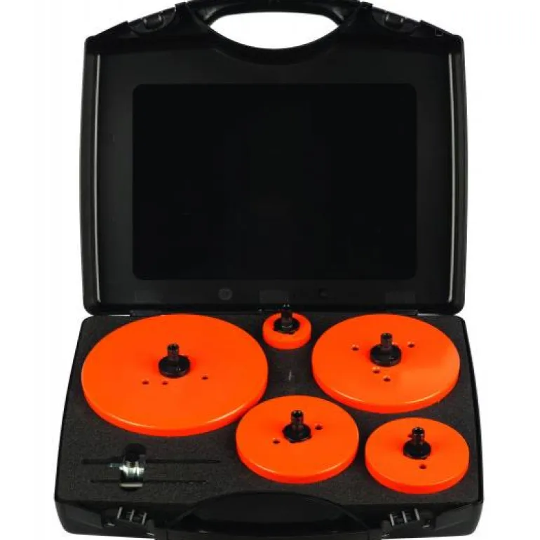 Reikäsahasarja ilmastointiasentajille. Sisältää 5 reikäsahaa, koot 57, 111, 133, 168 ja 210 mm, sekä poran ja istukan. Reikäsahojen leikkuusyvyys on 60 mm ja niiden leikkuuteho ja luotettavuus on lyömätön karbidipinnoitettujen hampaiden ansiosta.