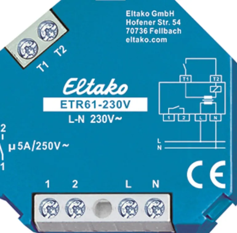 ETR61-230V on rele, jossa on 1 NO-kosketin, potentiaalivapaa 5 A/250 V AC. Valmiustilan kulutus on 0,5 wattia.