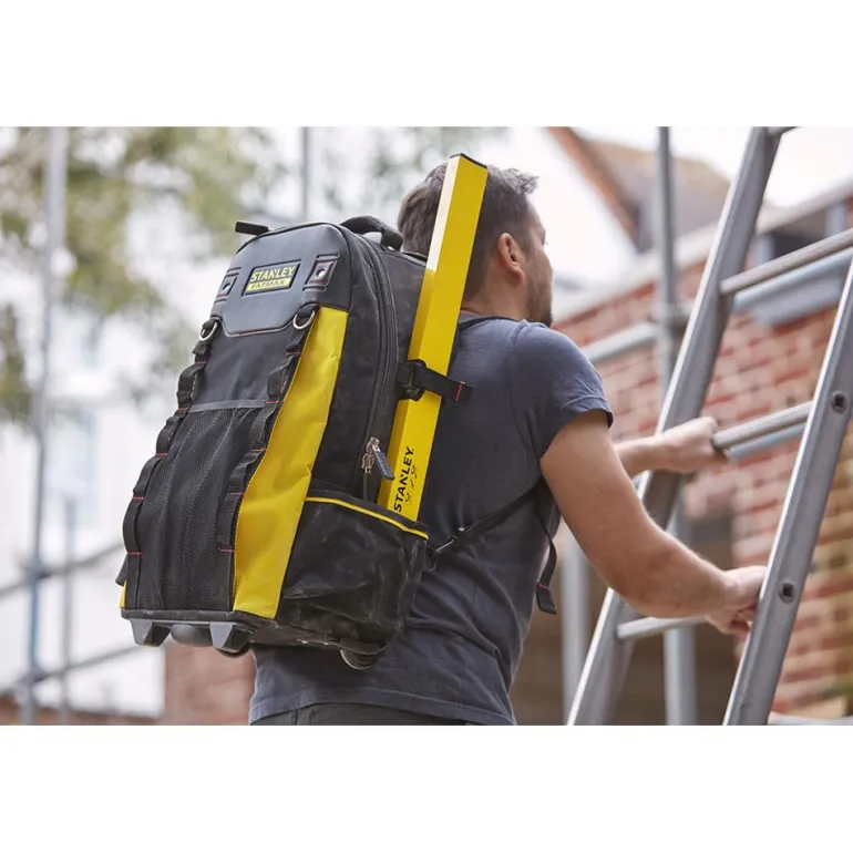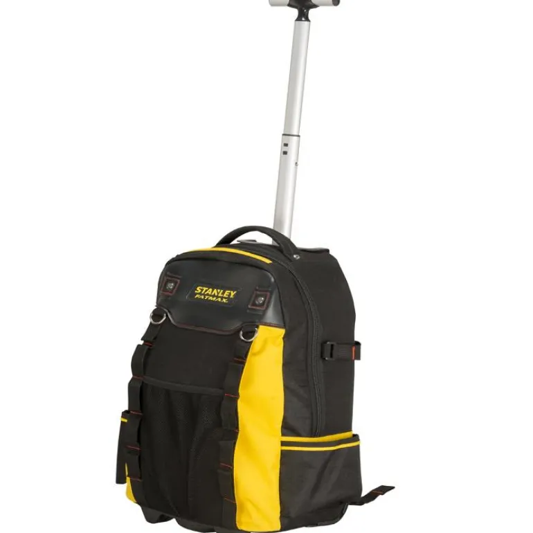 STANLEY 1-79-215 on kestävästä 600x 600 denierin kankaasta valmistettu reppu, jossa on kaksisuuntainen vetoketju sekä läpinäkyvä lokero ja paljon helppokäyttöisiä silmukoita pakkaamisen avuksi. Silmukat lisäävät kiinnitysvaihtoehtoja. Helppo pääsy henkilökohtaisiin tavaroihin, jotka ovat eri tilassa. Irrotettava jakaka, jossa on paljon taskuja erilaisille työkaluille. Jäykkä rakenne pysyy auki, joten työkalut ovat helposti saatavilla. Erillinen, vankka lokero sähkötyökaluille tai kannettavalle tietokoneelle. Pyörällinen reppu on täydellinen yhdistelmä työkalujen helppoon ja mukavaan kuljettamiseen. Vetokahva pyörillä kuljettamista varten.
