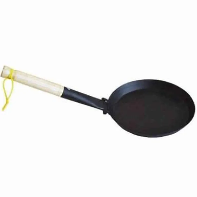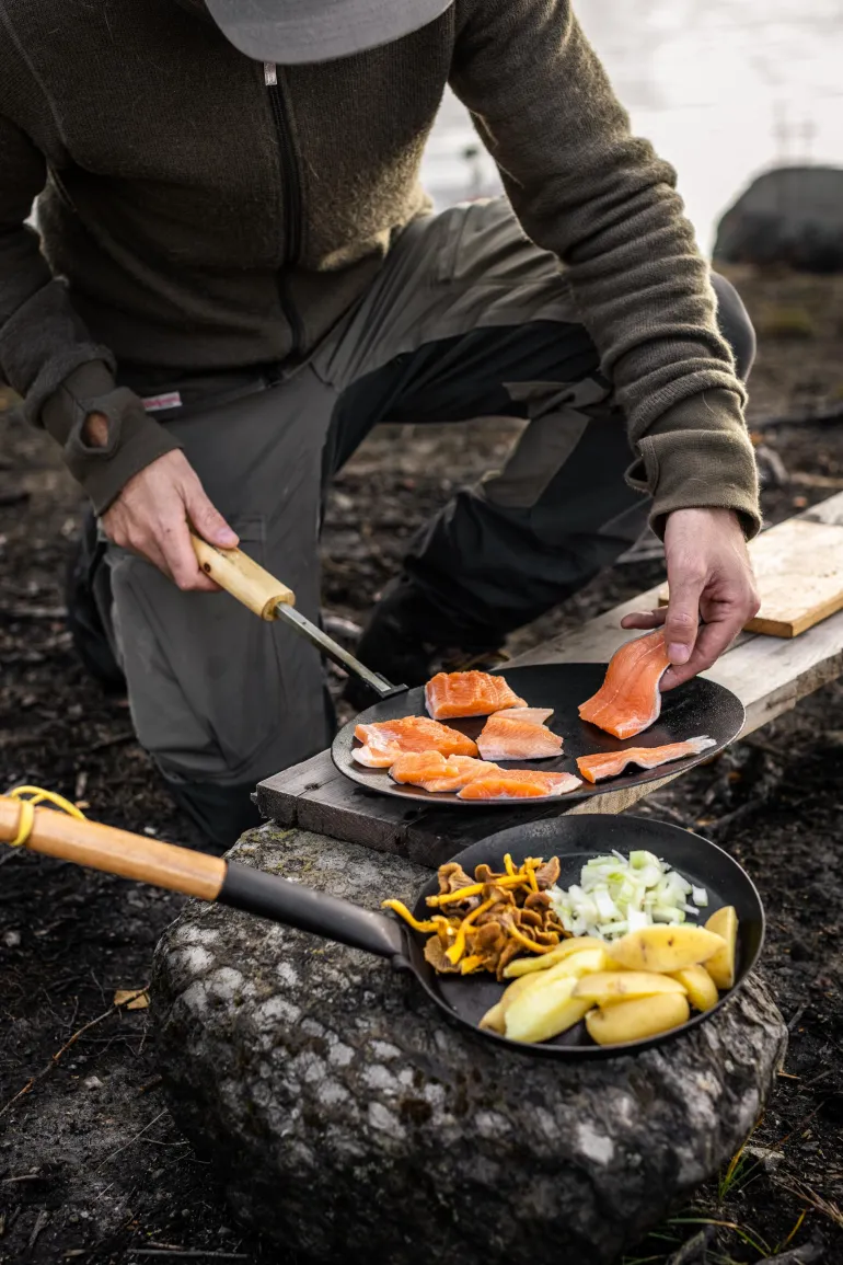 Ohut, kevyt ja kätevä retkipaistinpannu, jossa on taittuva puukahva.