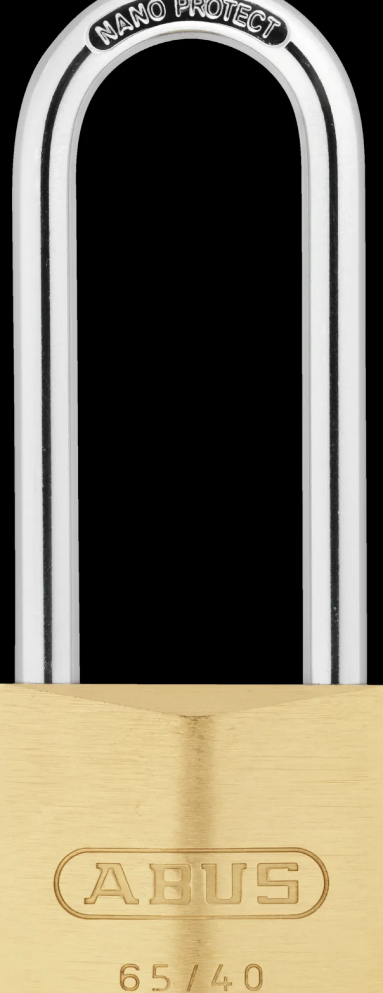 Messinkiriippulukko, jossa karkaistu terässanka NANO PROTECT™-pinnoitteella. Runko massiivimessinkiä. Sisäkomponentit ei-korrosiivista materiaalia. Luokka 1 (SBSC), luokka 2 (DIN EN 12320).