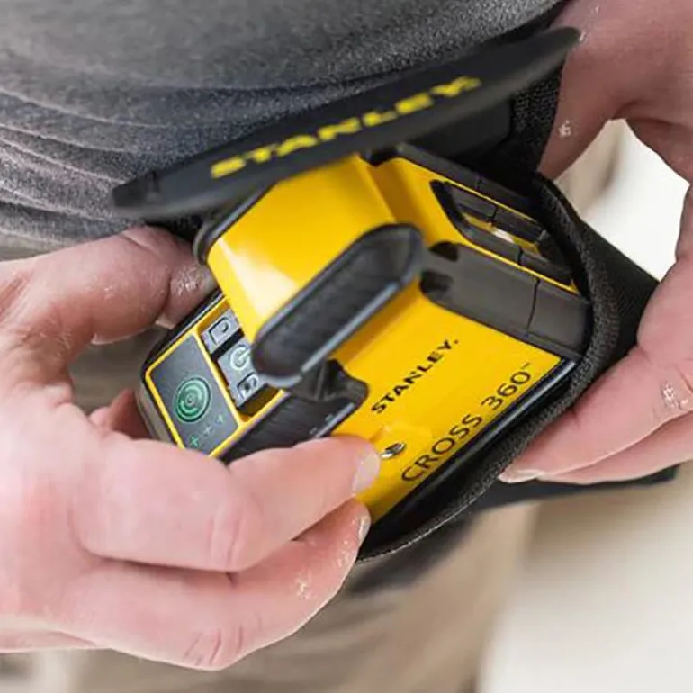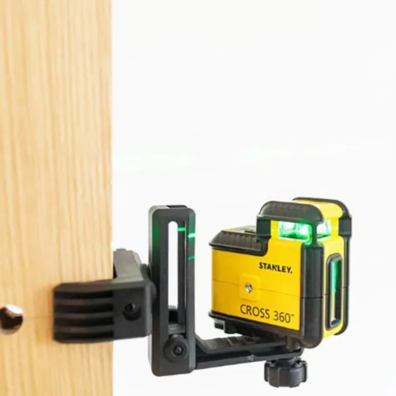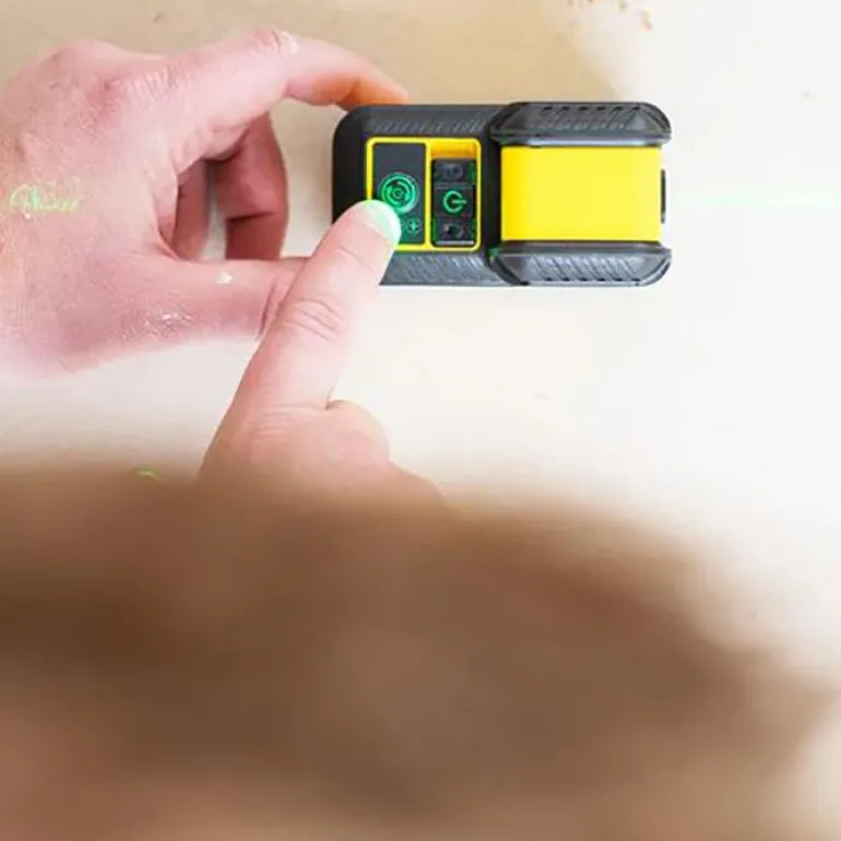 Ristilaser, tarkkuus +/- 4mm @ 10 m. Vihreä lasersäde tarjoaa suuremman työskentelyalueen ja paremman näkyvyyden.