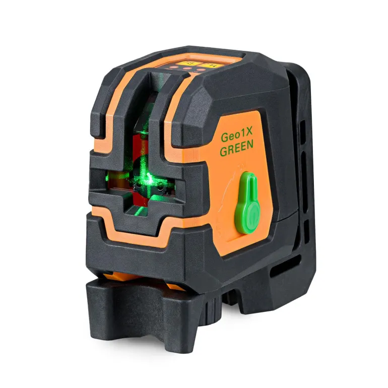 Geo Fennel GEO-X1 Green on ristilinjalaser, jossa on selvästi näkyvät vihreät laserviivat. Vankka kotelo, helppo käyttää – ihanteellinen kumppani sisätiloissa työskentelyyn.