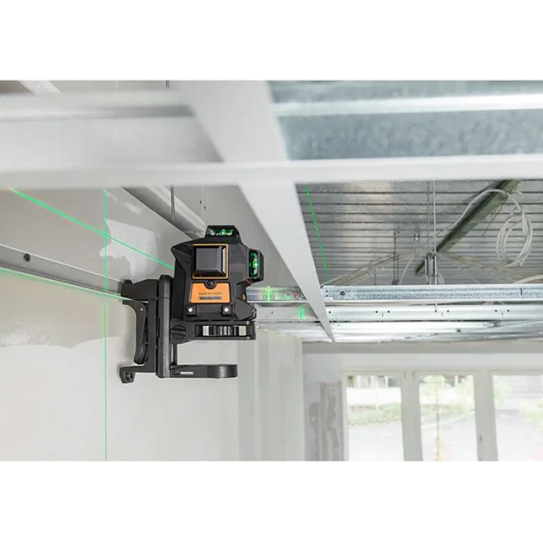 Ristilaser kolmella 360° laserlinjalla, jotka muodostavat 6 laserristiä linjojen kohdatessa 90° seinää, kattoa ja lattiaa vasten. Toimintasäde on 80 m tai jopa 140 m laservastaanottimen kanssa. Itsevaaitusalue jopa 3°.