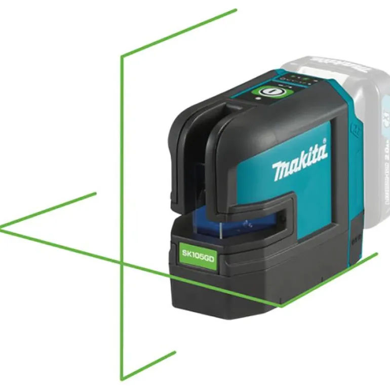 Makita SK105GDZ on 12 V Itsetasaava ristilaser.Vihreä pysty- ja vaakaviiva erikseen tai yhdessä. Kaikki toiminnot yhdellä painikkeella. IP54 roiskevesi- ja pölysuojaus. Toimitetaan ilman akkua ja laturia.