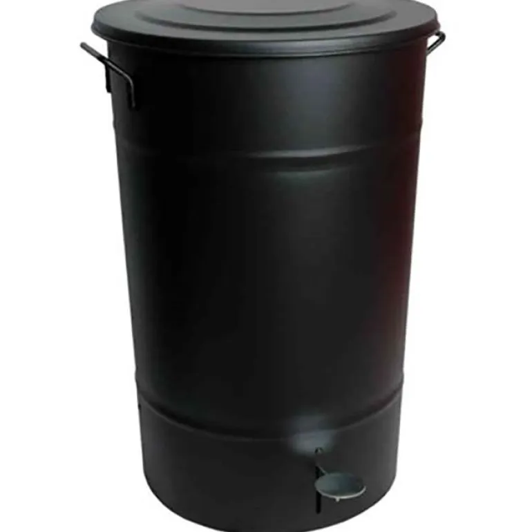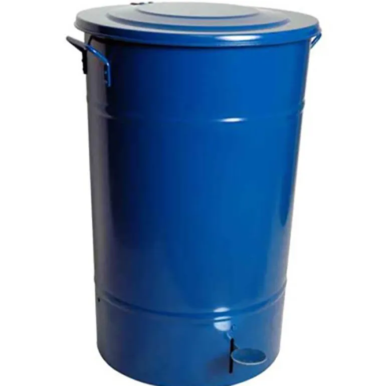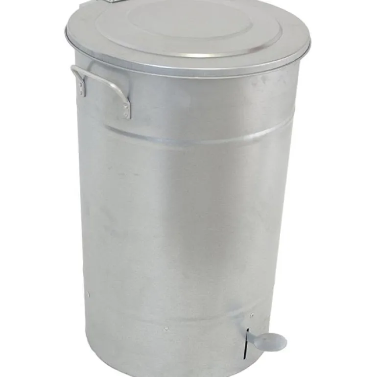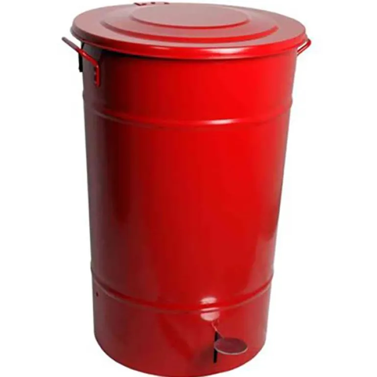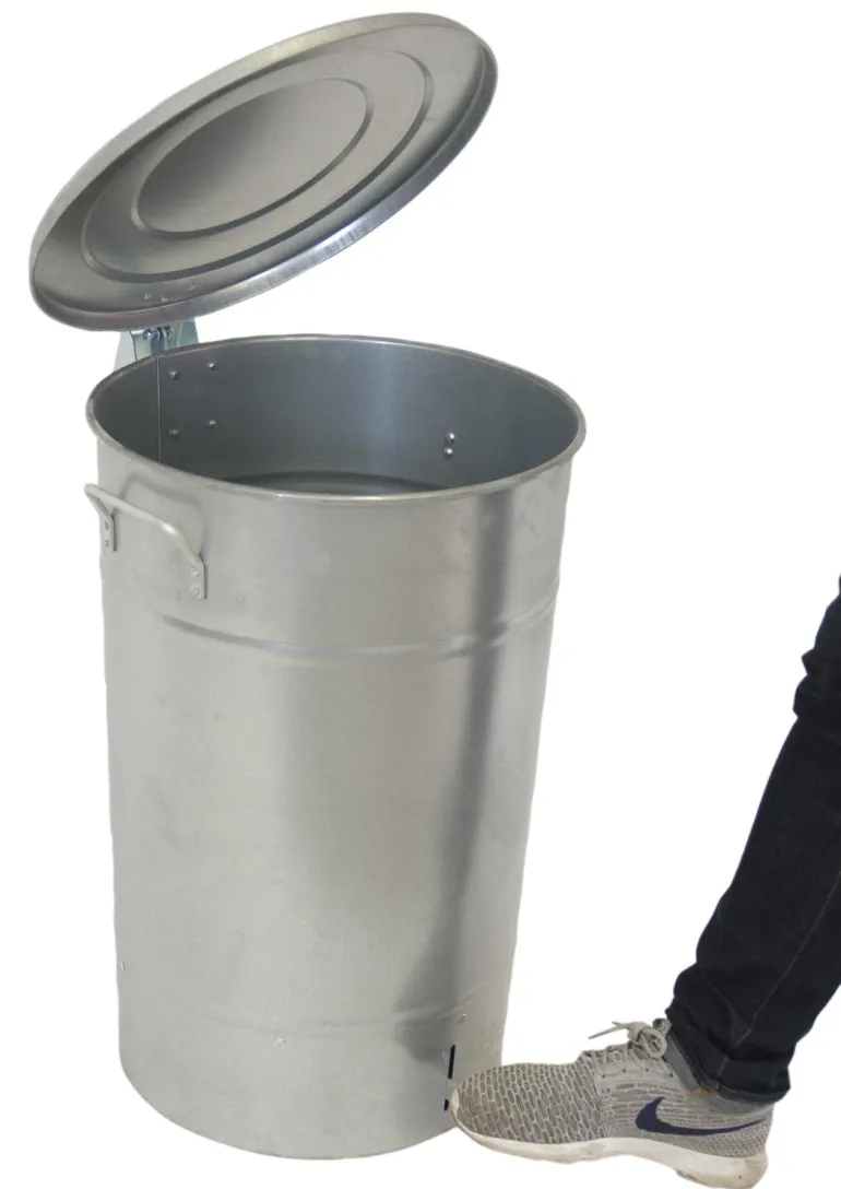 Peltinen roska-astia, jonka molemmilla sivuilla on kantokahvat.