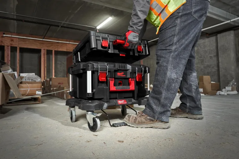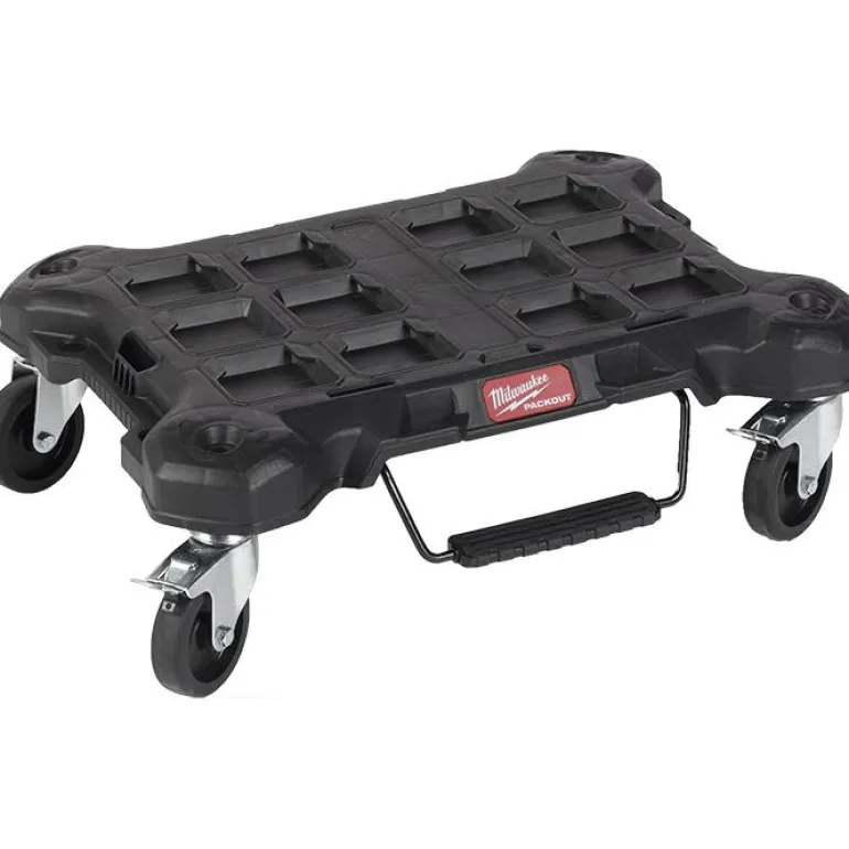 Rulla-alusta, paino 113 kg, kestävät pyörät, jotka rullaavat kevyesti raskaallakin kuormalla. Varustettu lukkojarrulla ja sivulukolla, jotta PACKOUT™-laatikot ja -salkut on helpompi kuormata. 610 x 480 x 190 mm.