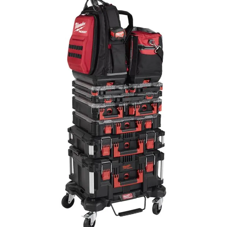 Milwaukee 4932471068 Packout on rulla-alusta, paino 113 kg, kestävät pyörät, jotka rullaavat kevyesti raskaallakin kuormalla. Varustettu lukkojarrulla ja kahdella sivulukolla, jotta PACKOUT™-laatikot ja -salkut on helpompi kuormata. Rulla-alustan mitat ovat 610 x 480 x 190 mm (P x L x K).