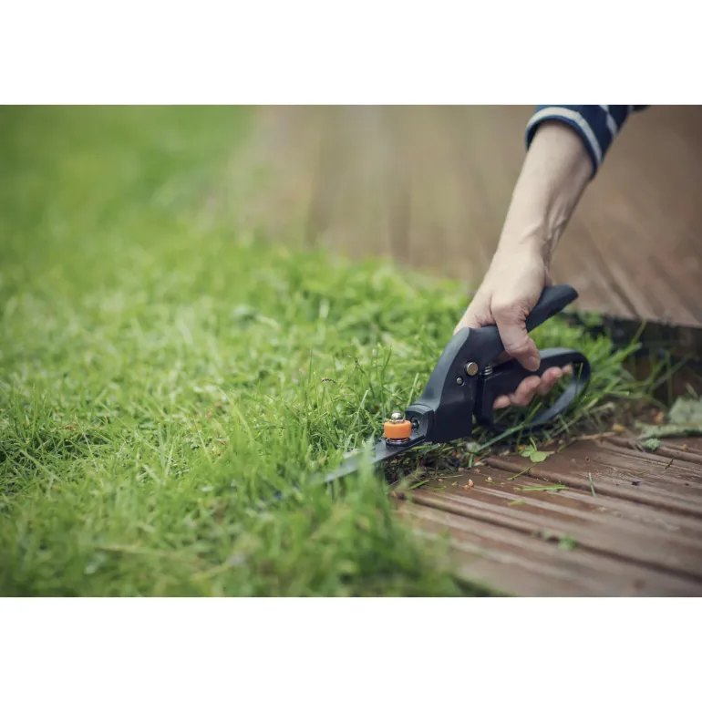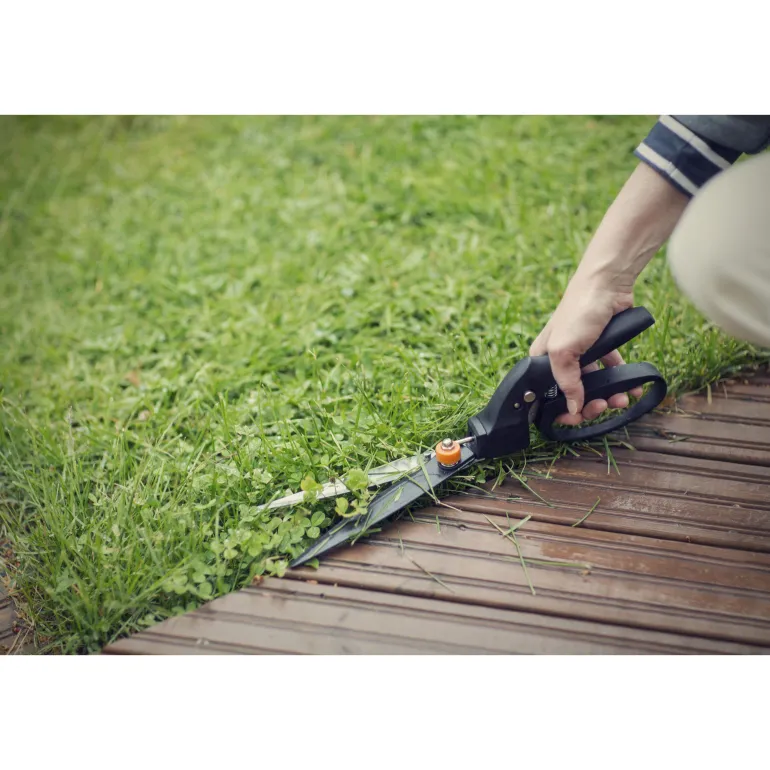Trimmaa nurmikon reunat ja pensasaidat. Säädettävä leikkuukulma 180°. Ergonomisesti muotoiltu kumikahva sormisuojalla.
