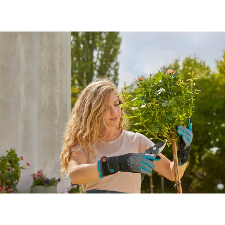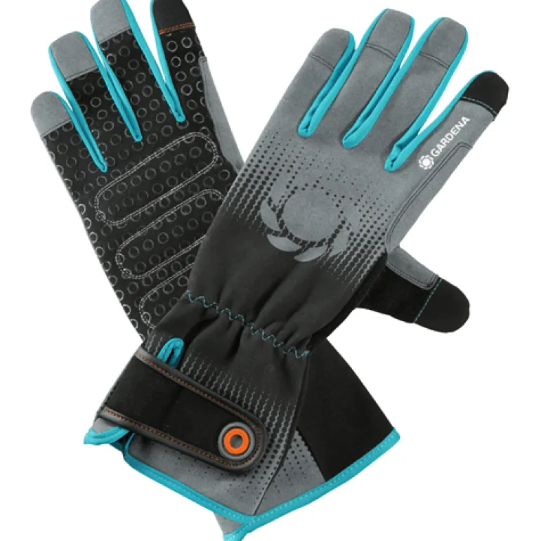 Piikkikasvit on myös hoidettava ja GARDENAn M-kokoiset ruusukäsineet sopivat tähän täydellisesti. Kestävissä puutarhakäsineissä on pitkä ranneosa ja säädettävä ranneke, jotka suojaavat rannetta ja kyynärvarren alaosaa. Lisäksi erityisen herkät kohdat, kuten sormet ja kämmenosa, on vahvistettu aramidilla. Materiaali on pistonkestävää, joten piikikkäät kasvit eivät enää ole ongelma. Käsineet ovat erityisen käytännölliset, sillä peukalon ja etusormen kohdalla olevan Mobile Touch -ominaisuuden ansiosta voit käyttää älypuhelinta helposti. Käsineitä ei siis tarvitse riisua, sillä ne ovat yhteensopivat kosketusnäytön kanssa. Ruusukäsineet paitsi suojaavat naarmuilta, ne ovat myös Öko-Tex® 100 -sertifioitu, mikä tarkoittaa, ettei niissä ole käytetty haitallisia aineita.