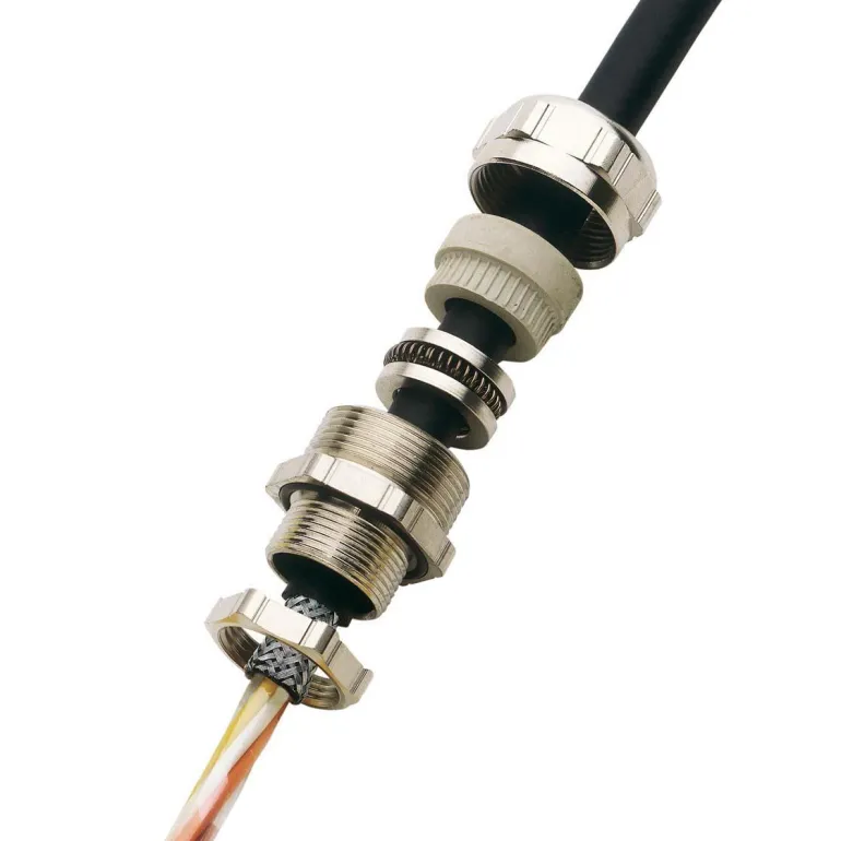 Nikkelipinnoitettua messinkiä. Holkkitiiviste sisältää pehmeän PVC-tiivisteen ja jousirenkaan kaapelin häiriösuojan maadoittamiseen.