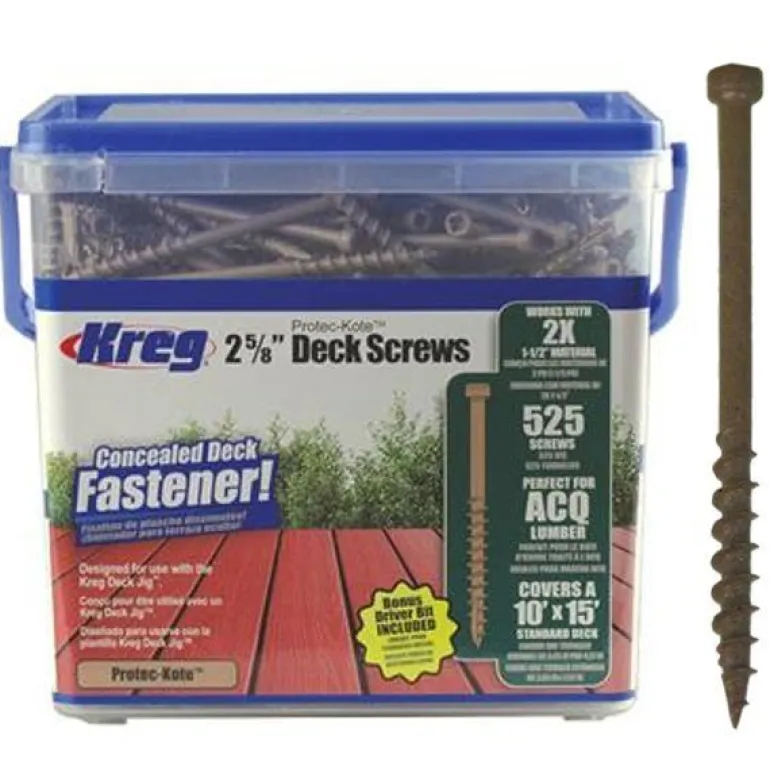 Kreg SDK-C262W-525 on 525 kpl 67 mm:n ruuveja ulkokäyttöön, 30-40 mm paksuille terassilaudoille. Protec-Kote-suojaus, väri sulautuu painekyllästettyyn terassilautaan.