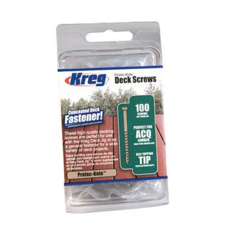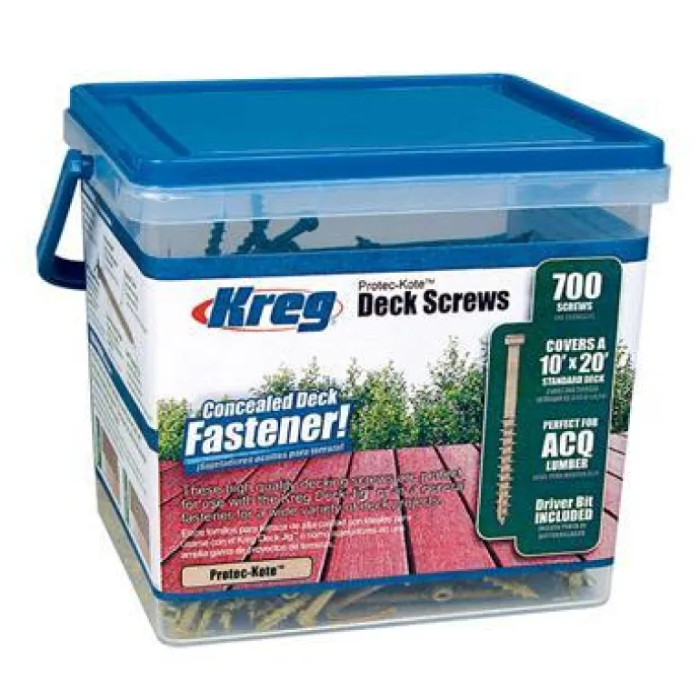 Kreg SDK-C2W-700 on 700 kpl 51 mm:n ruuveja, jotka soveltuvat ulkokäyttöön, kuten puuterasseihin. 3 korroosionestokerrosta ruostumisen estämiseksi. Neutraali väri sopii useimpiin terasseihin.