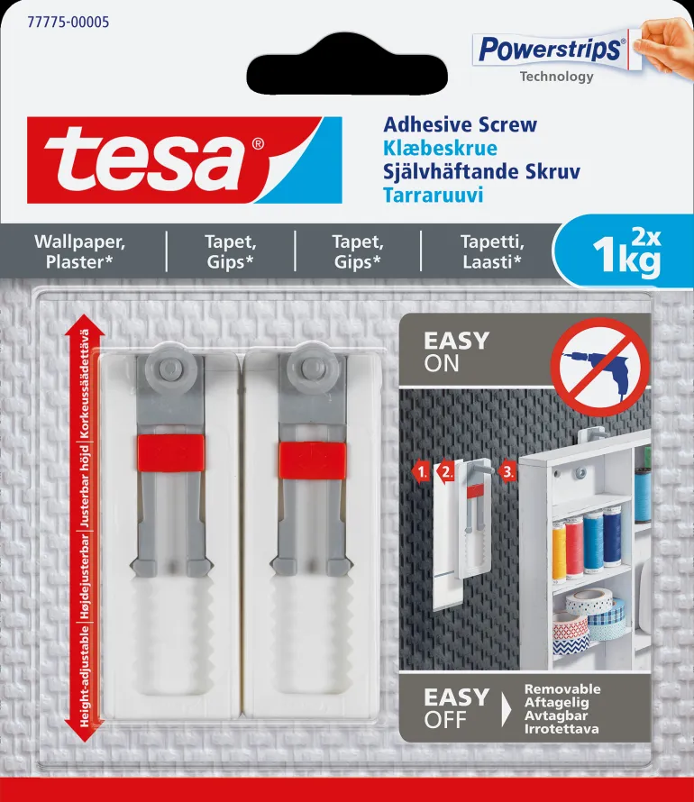 Nämä säädettävät itsekiinnittyvät ruuvit on kehitetty niin vahvoiksi, että ne kestävät 1 kg painon tai 2 kg painon kahdella ruuvilla, mutta ne ovat riittävän hellävaraisia käytettäväksi herkillä pinnoilla, kuten tapetilla ja laastarilla, koriste- ja tarve-esineiden ripustamiseen.