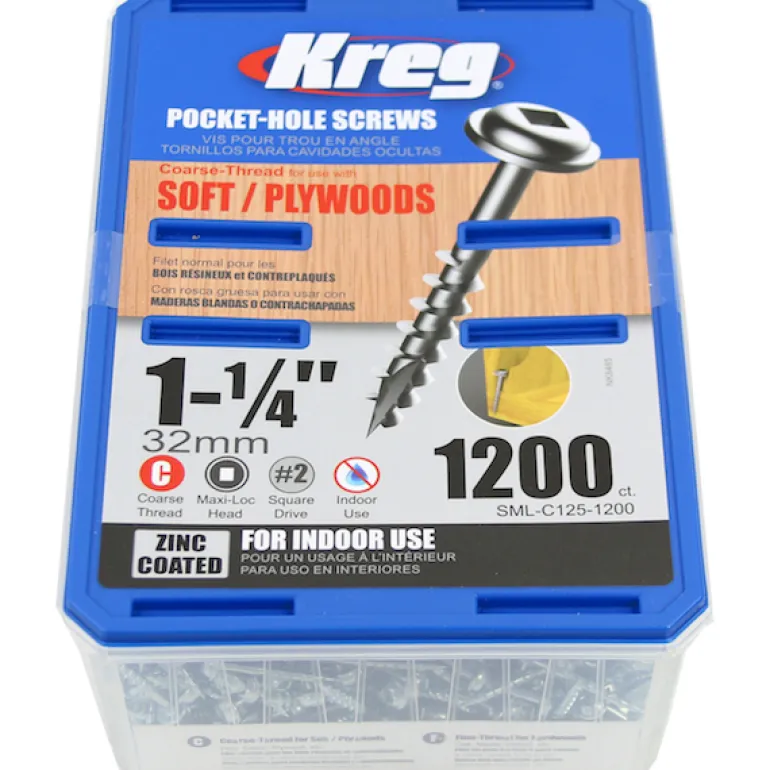 Kreg SML-C125-100 on 100 kpl harvakierteisiä galvanoituja 32 mm:n ruuveja, Maxi-Loc-pää.