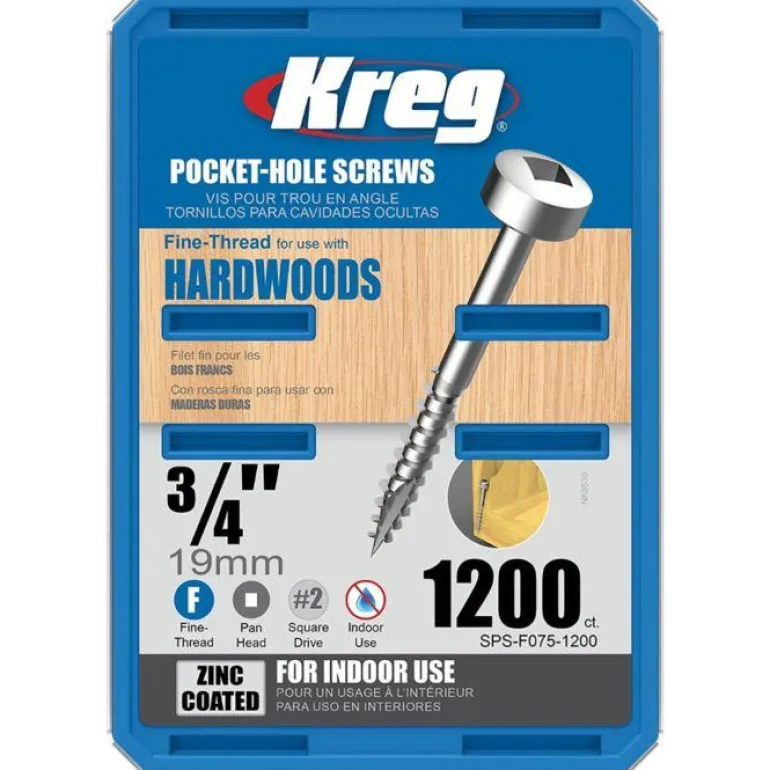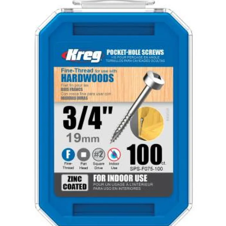 Kreg SPS-F075-100 on 100 kpl 19 mm:n ruuveja. Ruuvi on hienokierteinen ja sinkitty ja sopii 12 mm:n levylle. Saatavissa eri malleja.