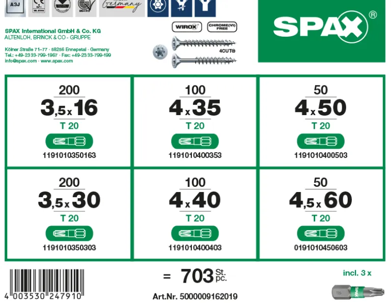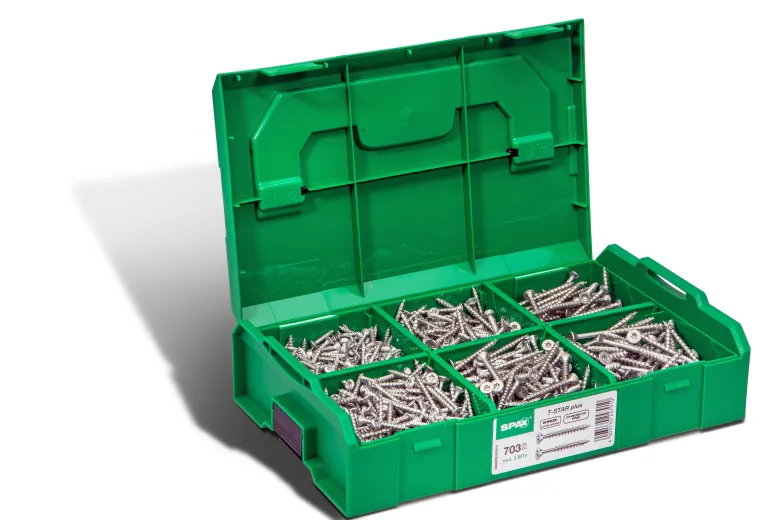 Spax -yleisruuvilajitelma muovisalkussa, joka pitää sisällään 700 kpl Torx -uppokantaruuvia sekä 3 kpl tx-kärkiä seuraavasti: 3,5×16-3,5×30-4,0×35-4,0×40-4,0×50-4,5×60. T-STAR plus -muotoilu, 4CUT ja WIROX -pinnoite.