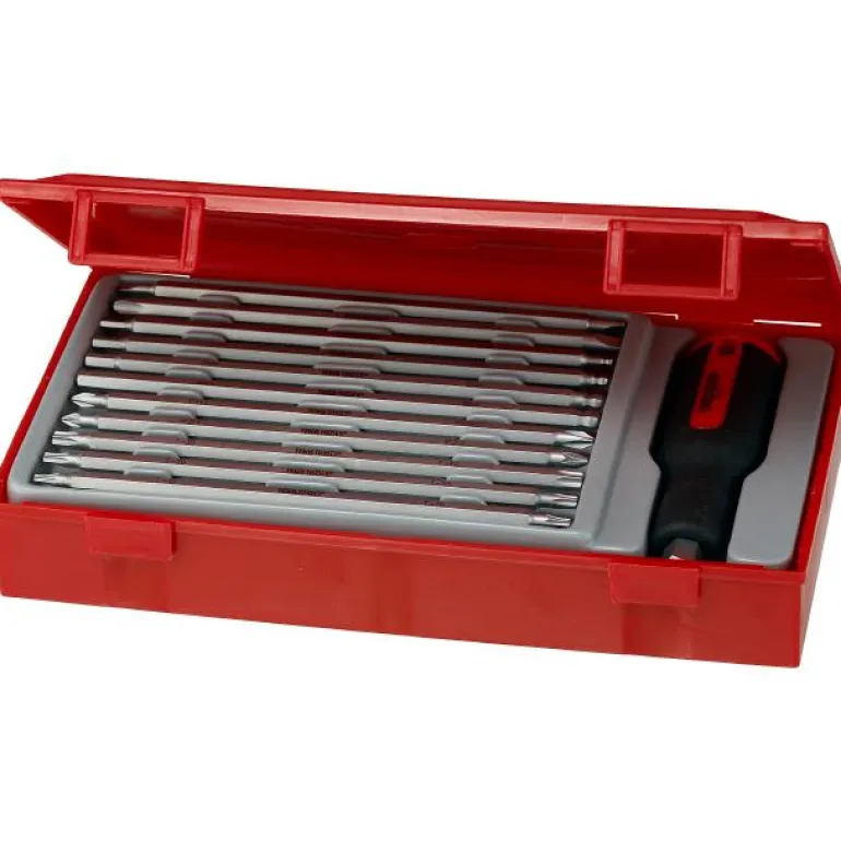 12-osainen ruuvitalttasarja Sisältää ruuvitalttakahvan ja 11 käännettävää ruuvitalttapäätä, joissa on talttapää kummassakin päässä.