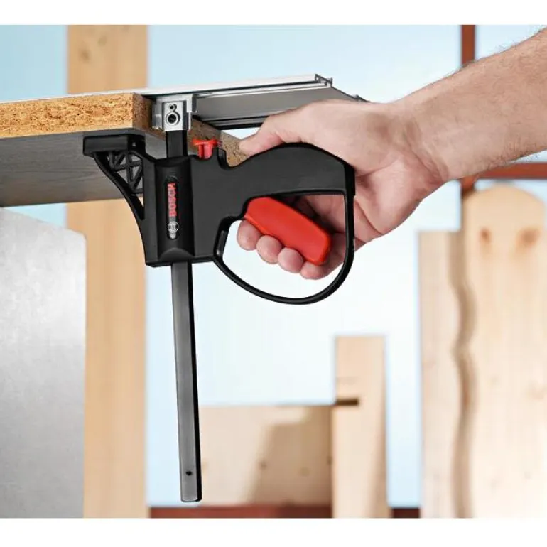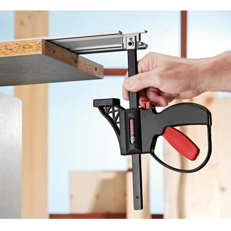 Kaksi ruuvipuristinta Bosch -ohjainkiskoihin (paitsi FSN 70 ja 140). FSN KZW puristin mahdollistaa ohjainkiskojen luotettavan ja nopean kiinnityksen työkappaleisiin.