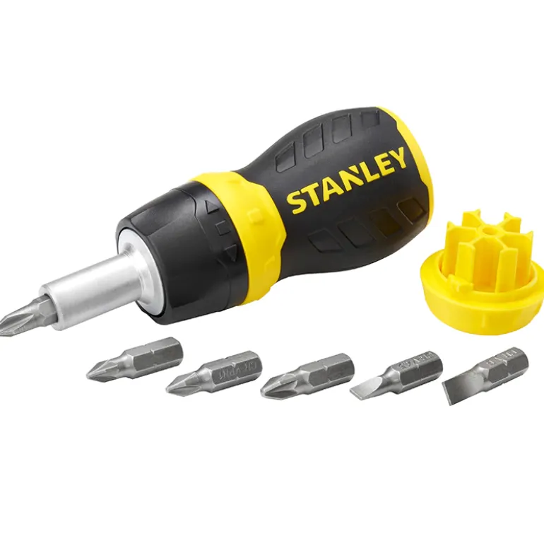 Ruuvitaltta ja ruuvikärjet, joita voi säilyttää ruuvitaltan sisällä. Ruuvitaltassa on magneettikärki ja räikkämekanismi (oikealle, vasemmalle ja lukittu).