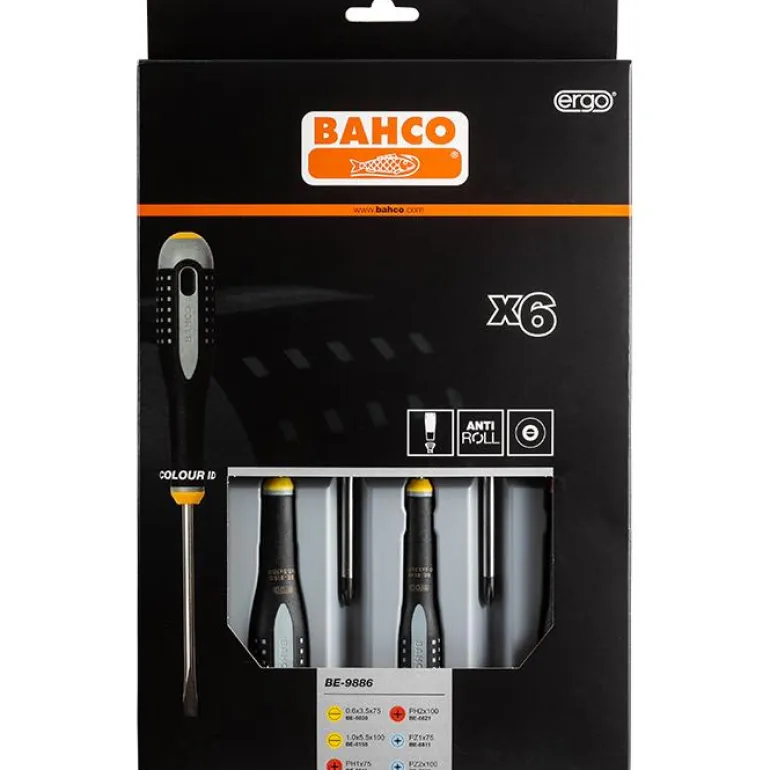 Bahco BE9886 on 6-osainen värikoodattu ERGO-ruuvitalttasarja, jonka ruuvitalttojen kahvoissa pyörimistä ehkäisevä muotoilu. Ura-, Phillips- ja Pozidriv-ristipääruuveille.