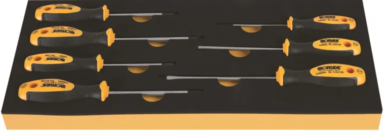 Erikoiskarkaistua kromimolybdeenivanadiiniterästä. Mustaoksidoidut kärjet. Ergonominen kädensija kaksikomponenttimateriaalista.