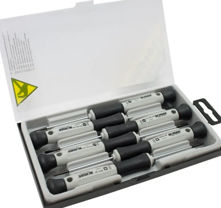 Kätevässä säilytysrasiassa oleva sarja, joka sisältää 6 kpl tavallisimpia sähköruuvitalttoja. Niklatut kromi-molybdeeni-vanadiiniteräksiset terät mustatuilla kärjillä lisäävät tarkkuutta ja kestävyyttä. Ergonomisesti muotoillut kaksikomponenttikahvat joissa kiertyvä pää. Hyväksytty ESD-normien mukaisesti.