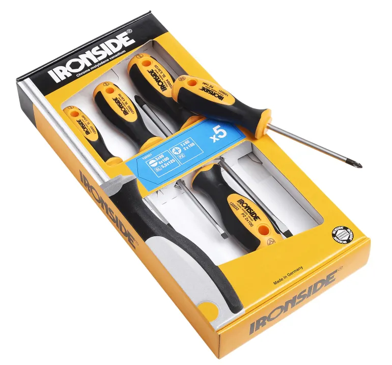 Pakkaus sisältää 5 ruuvimeisseliä. Terät valmistettu erikoiskovasta kromi-molybdeeni-vanadium -teräksestä.
