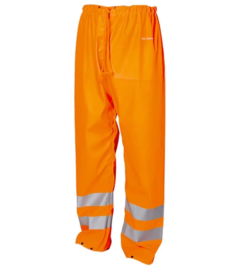 Top Swede 2295 on oranssit sadehousut huomiovärillä (luokka 2). Resori ja säädettävä kiristysnyöri vyötäröllä sekä säädettävä nappikiinnitys lahkeensuussa. Housuissa on hitsatut saumat ja ne on valmistettu polyuretaanilla päällystetystä joustavasta kankaasta. EN ISO 20471 luokka 2. EN 343 3/1. Saatavissa eri kokoina.