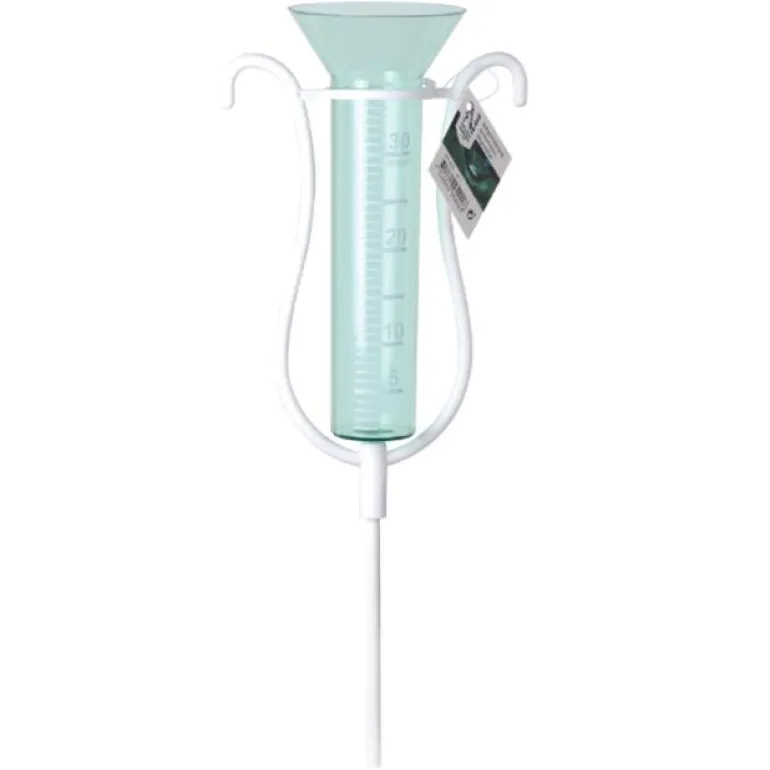 Sademittari, vihreää muovia. Mitta-asteikko 35 mm:iin. Jalka valkoista jauhemaalattua metallia. Kokonaiskorkeus 90 cm. Sademittari tulee ottaa sisälle talveksi. Mittariin jäänyt vesi voi jäätyessään rikkoa mittarin.