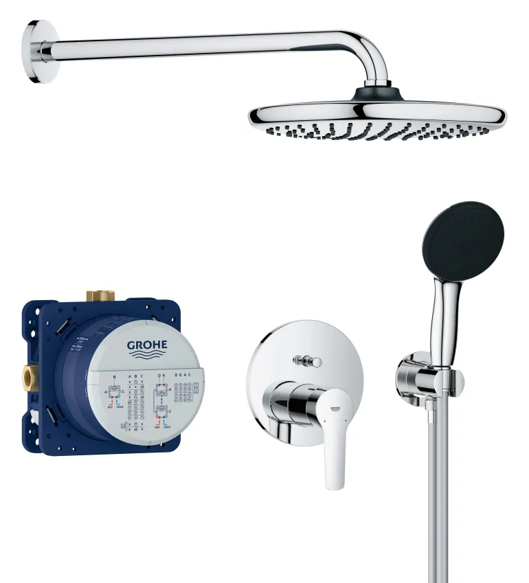 250 mm:n sadesuihku 380 mm:n suihkuvarrella tarjoaa pehmeän ja rentouttavan Rain-suihkun. 110 mm:n käsisuihku tarjoaa sekä voimakkaan ja kohdistetun Jet-suihkun että rauhoittavan Rain-suihkun, joita ohjataan Grohe SmartSwitch -ohjaimella. Jet Spray on voimakas ja kohdennettu, täydellinen shampoon huuhteluun ja Rain tarjoaa pehmeän ja rentouttavan suihkukokemuksen. Käsisuihkun mukana tulee käsisuihkun seinäpidike seinäliitännällä ja 1500 mm:n suihkuletku TwistStop-muotoilulla, joka estää letkun kiertymisen. Iskunkestävä silikonirengas suojaa vaurioilta käsisuihkun pudotessa. Grohe DreamSpray -teknologia takaa tasaisen vedenjaon jokaisesta SpeedClean -silikonisuuttimesta, jotka on lisäksi helppo puhdistaa sormella. Kestävä Grohe Long-Life -pinta on helppo pitää puhtaana ja säilyttää pinnat laadukkaina vuosien ajan.