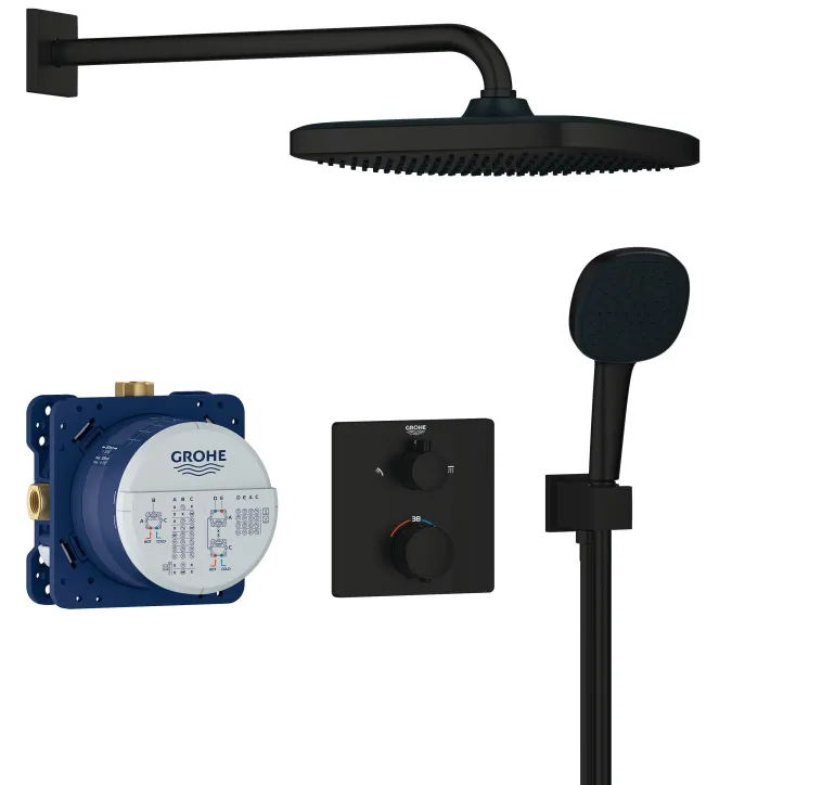 250×250 mm:n sadesuihku 380 mm:n suihkuvarrella tarjoaa pehmeän ja rentouttavan Rain-suihkun. 110×110 mm:n käsisuihku tarjoaa sekä voimakkaan ja kohdistetun Jet-suihkun että rauhoittavan Rain-suihkun, joita ohjataan Grohe SmartSwitch -ohjaimella. Käsisuihkun mukana tulee käsisuihkun seinäpidike seinäliitännällä ja 1500 mm:n suihkuletku TwistStop-muotoilulla, joka estää letkun kiertymisen. Grohe DreamSpray -teknologia takaa tasaisen vedenjaon jokaisesta SpeedClean -silikonisuuttimesta, jotka on lisäksi helppo puhdistaa sormella. Kestävä Grohe Long-Life -pinta on helppo pitää puhtaana ja säilyttää pinnat laadukkaina vuosien ajan. Grohe FastFixation -järjestelmän ansiosta etupaneelin asennus on helppoa – lukitusjärjestelmä, etulevy ja tiiviste seinää vasten, joka estää vuotojen riskin.