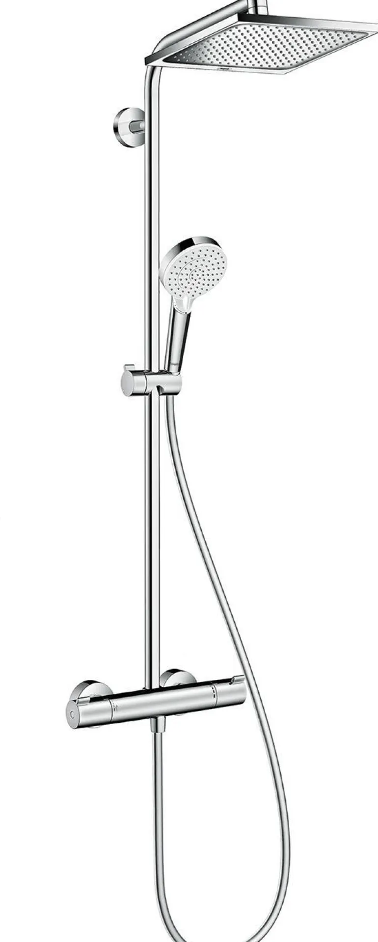 Hansgrohe Crometta E 240 sadesuihkusetti 150 cc, jossa yläsuihku, käsisuihku, suihkuhana, suihkutanko, suihkuletku ja liukusäädin.